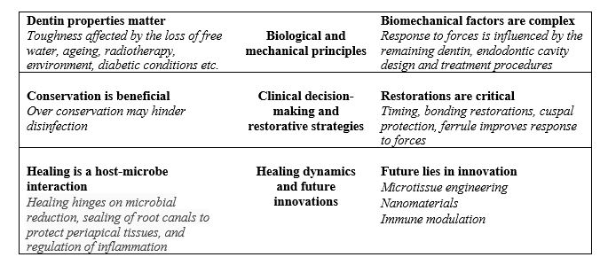 In the context of endodontics, the biological objective of treatment is to prevent and treat apical periodontitis while preserving the long-term function, aesthetics, and health of the tooth and surrounding structures. As apical periodontitis is a microbial/biofilm-associated disease, successful treatment relies on effective disinfection of the root canal system, proper obturation, and restoration. However, achieving these goals necessitates access, instrumentation, and preparation of the canal system, all of which involve removal of dentin. The cumulative loss of dentin due to both caries and procedural intervention can ultimately weaken the structural integrity of the tooth, increasing the risk of fracture and potentially compromising its long-term functionality.