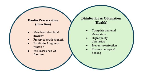 Figure 3: Diagram emphasizing the balance between dentin preservation (function) and disinfection with obturation (health) in endodontic treatment. Preservation must not compromise disease control.